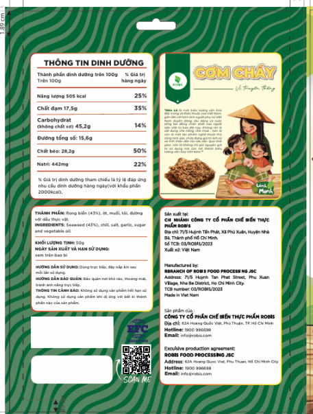 Đây là bước quan trọng nhất trong cách nhận biết Robis chính hãng. Tất cả sản phẩm từ cơm cháy Robis, rong biển sấy đến bánh tráng đều có thiết kế đồng nhất, được sản xuất và in ấn chuyên nghiệp.